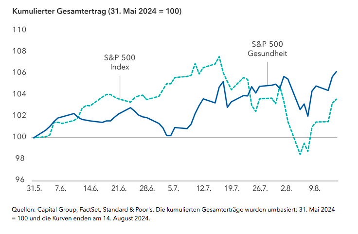 „Zugleich könnten Investoren, die eine nachlassende Konjunktur befürchten, ihre Positionen im Gesundheitssektor grundsätzlich überdenken“, fügt er hinzu. Der Sektor hat sich in der Regel in Abschwüngen besser gehalten als der S&P 500 insgesamt, weil Verbraucher üblicherweise nicht an lebenswichtigen Medikamenten sparen.