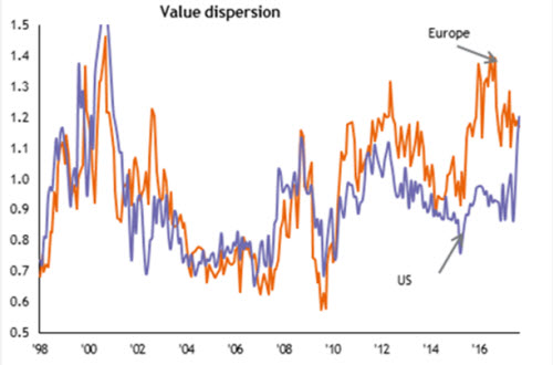 Die direkte Folge der Marktführerschaft von Quality-Growth-Aktien seit Anfang 2017 war ein starker Anstieg der Bewertungsunterschiede an den Aktienmärkten. Sowohl in Europa als auch in den USA sind Bewertungsunter-schiede zwischen den teuersten und günstigsten Aktien innerhalb aller Sektoren auf einem sehr hohen Niveau nicht weit entfernt vom absoluten Höhepunkt der Technologieblase im Jahr 1999 und auf dem höchsten Stand seit Beginn des neuen Jahrtausends.