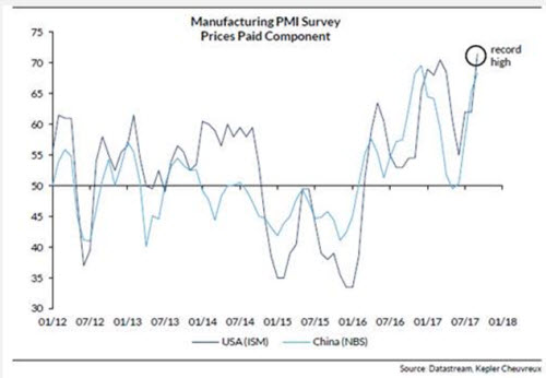 Zugleich ist der synchronisierte globale Aufschwung, den wir aktuell erleben und der durch starke gesamtwirtschaftliche Daten in Europa, den USA und China zum Ausdruck gebracht wird, ein weiterer Faktor, der eine Anlage in Value-Werte unterstützen dürfte. Sektoren wie Finanzen, baunahe Firmen und Werkstoffunternehmen werden vermutlich von einem besseren gesamtwirtschaftlichen Umfeld profitieren. Zudem korrelieren sie positiv mit steigenden Anleiherenditen und einer steigenden Inflation. Auch wenn die Inflation noch auf einem niedrigen Stand verharrt, dürften wir am Anfang einer neuen Welle wirtschaftlicher Belebung stehen, was jüngst durch den Einkaufsmanagerindex im herstellenden Gewerbe in Bezug auf die gezahlten Preise bestätigt wurde. Das verdeutlicht die zunehmende Preissetzungsmacht von Unternehmen in den USA und China, wie Grafik 2 illustriert. Die gesamt-wirtschaftliche Belebung gewinnt an Boden und unterstützt eher einen Value- als einen Quality-Growth-Ansatz.