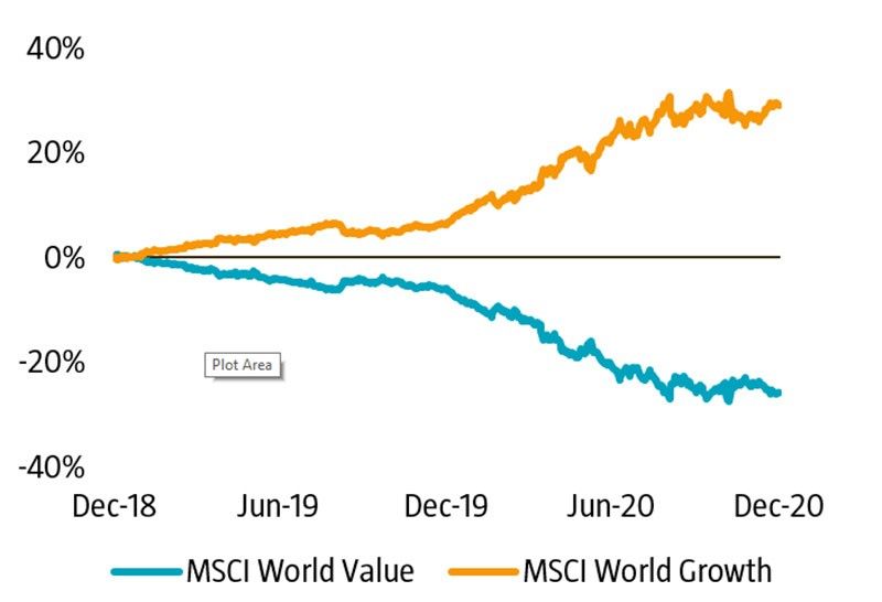 Growth-Aktien haben Value-Titel in den letzten zehn Jahren geschlagen. Die einzige Ausnahme von diesem Trend war das Jahr 2016, als Value-Aktien zeitweilig eine Outperformance in zweistelligen Prozentbereich erzielten. Seitdem haben Growth-Aktien stark an Wert gewonnen, hauptsächlich angeführt von einer Handvoll populärer Mega-Cap-Titel. Infolgedessen hat sich die Bewertungspanne zwischen Growth- und Value-Aktien ausgeweitet wie nie zuvor. Verantwortlich dafür war vor allem die ausgeprägte Performance-Diskrepanz in den letzten zwei Jahren per 31. Dezember 2020 (siehe Abbildung 1).