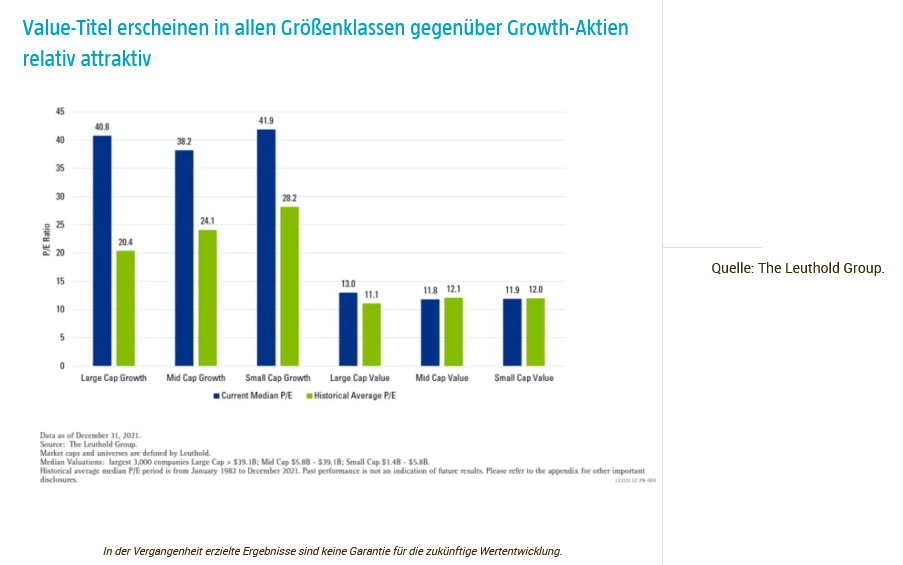 Ein solches Umfeld eignet sich gut für den Value-Anlagestil. Dieser hat sich besser als Growth-Aktien entwickelt, seitdem mit dem Start großangelegter Impfkampagnen im Jahr 2021 die wirtschaftliche Normalität zurückzukehren begann. Während des Markteinbruchs im Januar 2022, der durch Inflationssorgen ausgelöst wurde, schnitten Value-Aktien wesentlich besser ab als Growth-Titel, während die Anleger in relativ sichere Marktsegmente umschichteten.