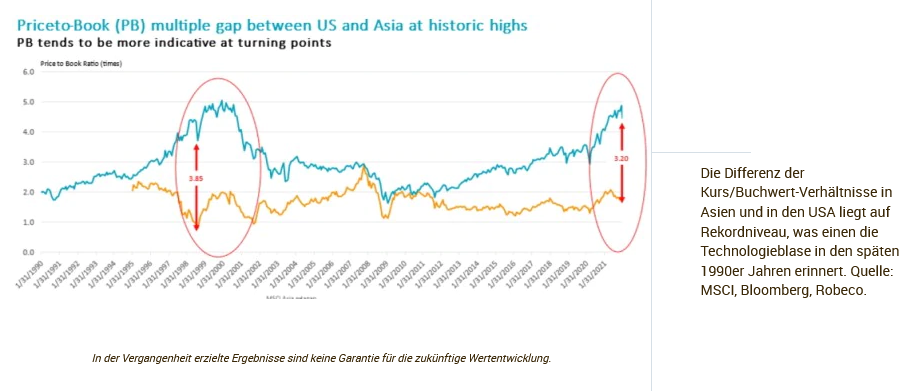 „Die asiatischen Aktienmärkte sind stark hinter den Börsen in der übrigen Welt zurückgeblieben, speziell im Jahr 2021. Aktien asiatischer Unternehmen werden derzeit im Durchschnitt mit dem 1,7-fachen des Buchwerts (per Ende 2021) gehandelt, bei US-Titeln liegt die Relation beim 4,9-fachen. Diese Differenz war seit der Technologieblase in den späten 1990er Jahren nicht mehr so ausgeprägt. Danach begann sie sich ziemlich drastisch ins Gegenteil zu verkehren. So setzten Value-Aktien aus Asien zu einer ausgeprägten Phase der Outperformance an.“