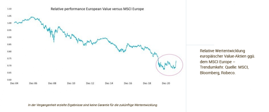„Insgesamt ist der Bullenmarkt an europäischen Value-Investoren vorbeigegangen. Mittlerweile glauben wir aber, dass diese Kombination aus einem eher moderaten Makroumfeld, höheren Zinsen, niedrigen Bewertungen und erholten Unternehmensgewinnen grünes Licht für das Value-Segment in Europa bedeutet.“