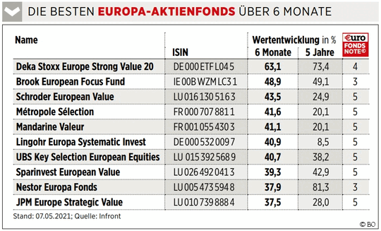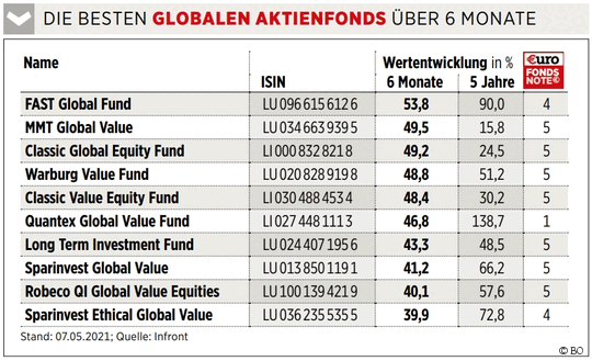 Die Rangliste der renditestärksten Fonds für globale und europäische Aktien auf Sicht eines halben Jahres zeigt diesen Wandel deutlich. In den Top Ten finden sich fast ausschließlich Portfolios, die nach einer Value-Strategie gemanagt werden. Dass es langfristig für viele von ihnen nicht so gut lief, offenbaren die €uro-FondsNoten: Etliche Value-Produkte tragen Note 5, weil sie sich in den vergangenen Jahren in ihrer Kategorie nur unterdurchschnittlich entwickelten.