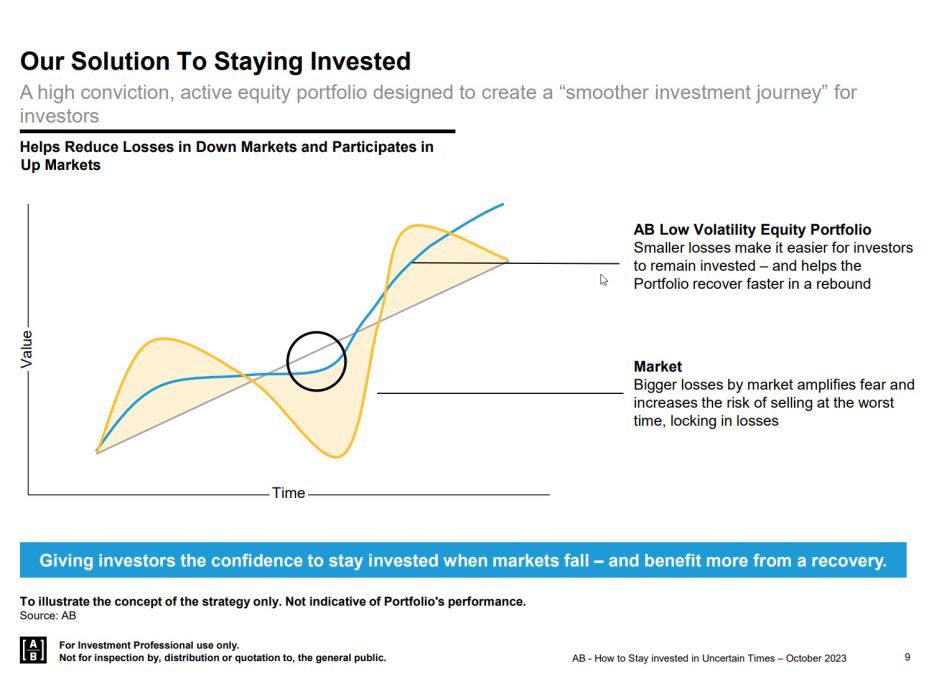 Fonds-Spezialistin Keane ist überzeugt, dass die Anlage in Aktien in der Regel die attraktivste Möglichkeit ist, langfristig höhere Renditen zu erzielen. Die Frage sei allerdings: Wie könne man als Anleger in einer zunehmend unsicheren Welt mit ruhigem Puls investiert bleiben? Die Antwort von AllianceBernstein (AB) auf diese Frage sei eine Fondsstrategie, die zwischenzeitliche Verluste begrenze und in den Aufholphasen nach einer Korrektur deshalb besser partizipiere. Der positive Effekt: Niedrigere Schwankungen im Portfolio sorgten für weniger Angst bei den Anlegern. Sie blieben deshalb kontinuierlicher investiert.