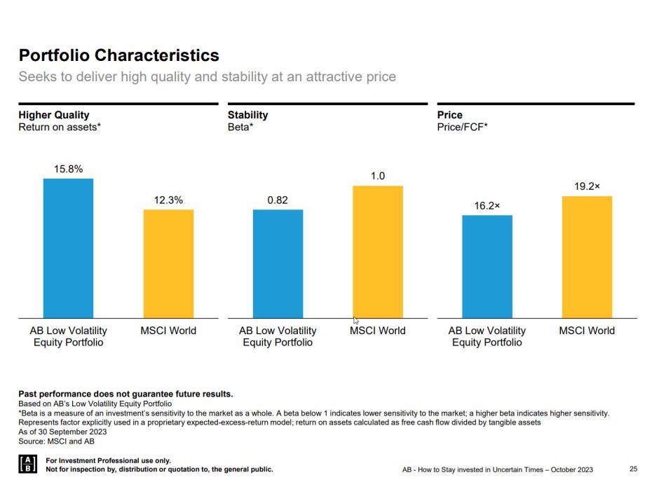 Unter dem Strich stehe am Ende der Titelauswahl ein Portfolio, das eine höhere Qualität habe als der MSCI World Index – und dies bei niedrigerer Volatilität und einem besseren Preisniveau. Dies schlage sich auch bei der Wertentwicklung nieder. So habe das AB Low Volatility Equity Portfolio nicht nur in den vergangenen zweieinhalb sehr turbulenten Börsenjahren, sondern auch langfristig klar besser als der MSCI World sowie der MSCI World Low Volatility abgeschnitten, und das bei einer niedrigeren Schwankungsbreite. Der Fonds sei einerseits für Anleger geeignet, die ihr Aktienportfolio diversifizieren möchten. Dies würde das Risiko im Depot reduzieren, das Risiko-Ertrags-Verhältnis verbessern und ein Risikobudget für Strategien mit höherer Rendite im Depot freisetzen. Aber auch als Ersatz für defensive Strategien im Gesamtportfolio mache der Fonds Sinn, so Keane. Das Potenzial zur Verbesserung der Gesamtrendite würde sich dadurch erhöhen und das Risiko moderat ansteigen.