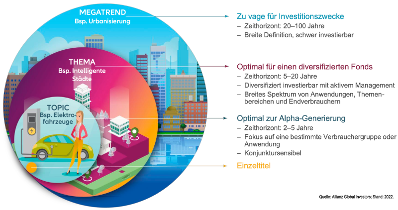 Der aktiv gemanagte Multithemen-Fonds Allianz Thematica setze seine Strategie fortlaufend auf drei Ebenen um, erklärt Wehner. So würden im ersten Schritt Themen mit langfristigen Treibern identifiziert. Dann prüfe das Fondsmanagement im zweiten Schritt kontinuierlich die Umsetzung der Themen und nehme Anpassungen vor. Denn unterschiedliche Bereiche innerhalb eines Themas könnten sich in verschiedenen Geschwindigkeiten entwickeln. Auf der dritten Ebene erfolge die gezielte Auswahl von Unternehmen und die Investition in Aktien mit dem größten Aufwärtspotenzial.