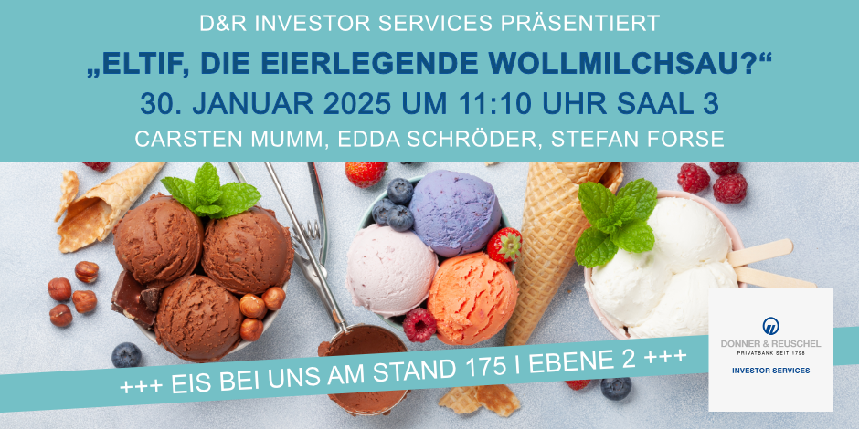 Was es mit unserem diesjährigen Vortragsslogan "ELTIF: die eierlegende Wollmichsau?" auf sich hat, erfahren Sie am 30.01.2025 um 11:10 Uhr im Saal 3. Diversifiziert, langfristig, nachhaltig, inflationsgeschützt und dazu EU-reguliert. Seien Sie dabei, wenn Carsten Mumm -D&R Chefvolkswirt, Edda Schröder -Gründerin & Geschäftsführerin Invest in Visions GmbH und Stefan Forse - D&R Niederlassung Luxemburg sich dem “ELTIF” (European Long-Term Investment Funds) widmen.