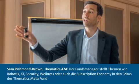 An der Börse werde nicht das Heute bewertet, sondern die Zukunft gehandelt. Die Kunst sei es deshalb, heute schon in die Themen von morgen zu investieren, erklärt Sam Richmond-Brown von Thematics AM. Relevante Themen seien beispielsweise Künstliche Intelligenz und Robotik, Sicherheit, die Weiterentwicklung der sogenannten Subscription Economy sowie die Themen Wasser und Wellness. In den Anlageprozessen seien Nachhaltigkeitskriterien auf allen Ebenen tief integriert. Denn Thematics verstehe sich als langfristig orientierter, verantwortlicher Investor.