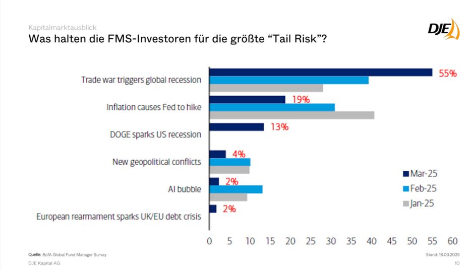 Als einen wichtigen Faktor für die veränderte Risikoeinschätzung vieler Marktteilnehmer macht Kaffarnik in seinem Vortrag „Geopolitik und Kapitalmarkt“ die Zollpolitik Donald Trumps aus. Sein Beleg: Einer Umfrage zufolge hielten 55 Prozent der Fondsmanager einen neuen Handelskrieg für die größte Gefahr, die eine weltweite Rezession auslösen könnte. Immerhin: Sollte Trump bei möglichen Verhandlungen mit anderen Ländern von seinen angekündigten harten Zollforderungen etwas zurückrudern, könnte dies zu einer Erholung der zuletzt gebeutelten Aktienmärkte führen.