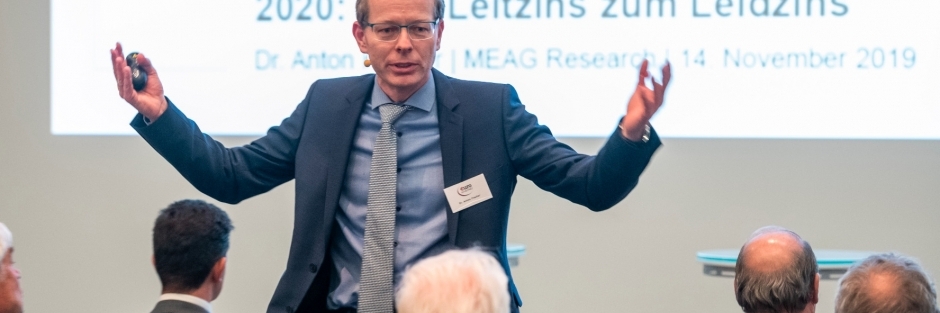 Für den Anleihe-Fan dürfte umso interessanter sein, wie Dr. Anton Fischer, Produktkoordinator Makroresearch bei der MEAG, die weitere Entwicklung der „Leidzinsen“ beurteilt. Der Keynote Speaker des Abends nimmt die aktuelle Zinsentwicklung unter die Lupe und gibt eine eindeutige Einschätzung: Die Negativzinsen werden auch 2020 vorherrschen, so der Volkswirt. Er zitiert Zahlen von Bloomberg, wonach das „Leidensgebirge“ – dasjenige Anleihevermögen, das inzwischen im negativen Bereich liegt, weltweit auf 12 Billionen Dollar angewachsen sei. Tendenz steigend, wofür nicht zuletzt das „Abschiedsgeschenk“ des bisherigen EZB-Chefs Mario Draghi sorgen werde: etwa die weitere Absenkung des Einlagenzinssatzes von -0,40 auf -0,50%, oder die Neuauflage des Quantitative Easings mit offenem Ende.