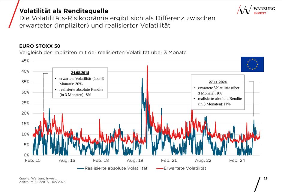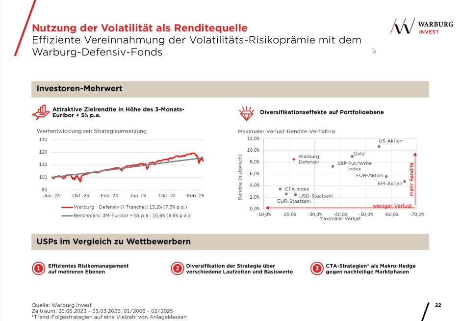 Anhand von historischen Daten verdeutlicht der erfahrene Kapitalmarktexperte, dass dieser Effekt über Jahrzehnte hinweg stabil geblieben sei. Besonders in Phasen erhöhter Unsicherheit steige die Volatilitätsrisikoprämie, was Anlegern zusätzliche Chancen biete. Entscheidend sei jedoch ein systematischer Ansatz, da kurzfristige Schwankungen sonst zu erheblichen Verlusten führen könnten. Dies werde im Warburg-Defensiv-Fonds umgesetzt. Der Fonds strebe eine attraktive Zielrendite in Höhe des 3-Monats-Euribor plus fünf Prozent im Jahr an.