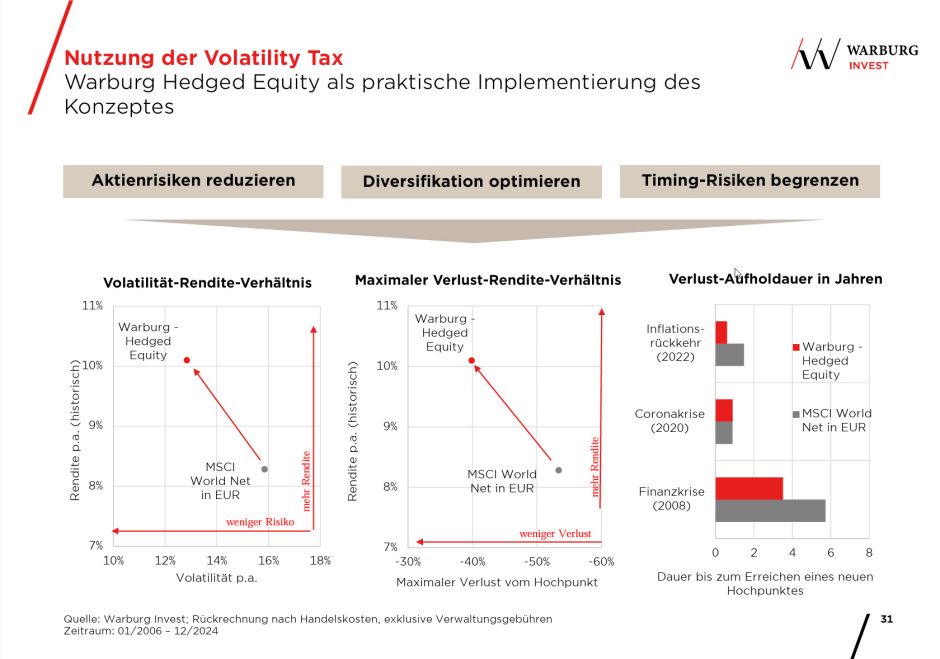 Ergebnis: Eine Reduktion der Volatilität um 30 Prozent bei gleichzeitiger Aufgabe von zehn Prozent der erwarteten Rendite erhöht die realisierte Rendite. Im Warburg Hedged Equity wird dieses Konzept aufgegriffen. Der Fonds soll im August dieses Jahres auf den Markt kommen.
