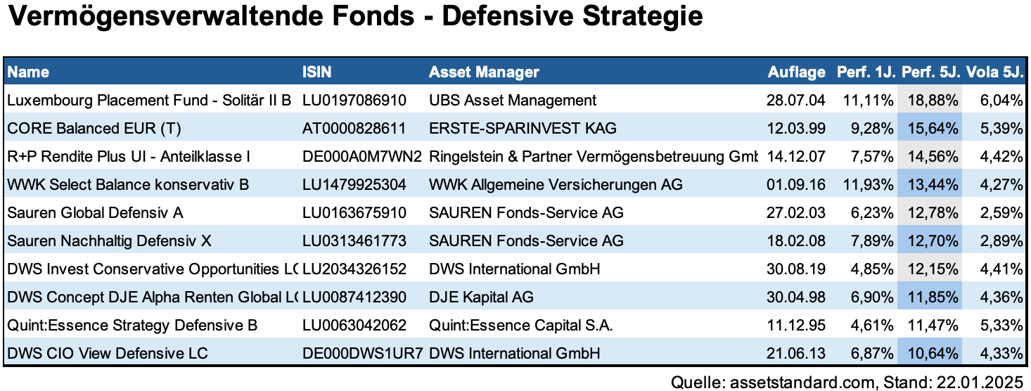 Der CORE Balanced EUR (T) wird von ERSTE-SPARINVEST KAG verwaltet und verfolgt eine ähnliche defensive Strategie. Der Fonds hat in den letzten fünf Jahren eine Performance von 15,64 Prozent erreicht. Ebenfalls erwähnenswert ist der R+P Rendite Plus UI - Anteilklasse I, verwaltet von Ringelstein & Partner Vermögensbetreuung GmbH. Dieser Fonds kombiniert defensive Anlagen mit einem gezielten Wachstumsgedanken und erzielte in den letzten fünf Jahren eine Rendite von 14,56 Prozent.