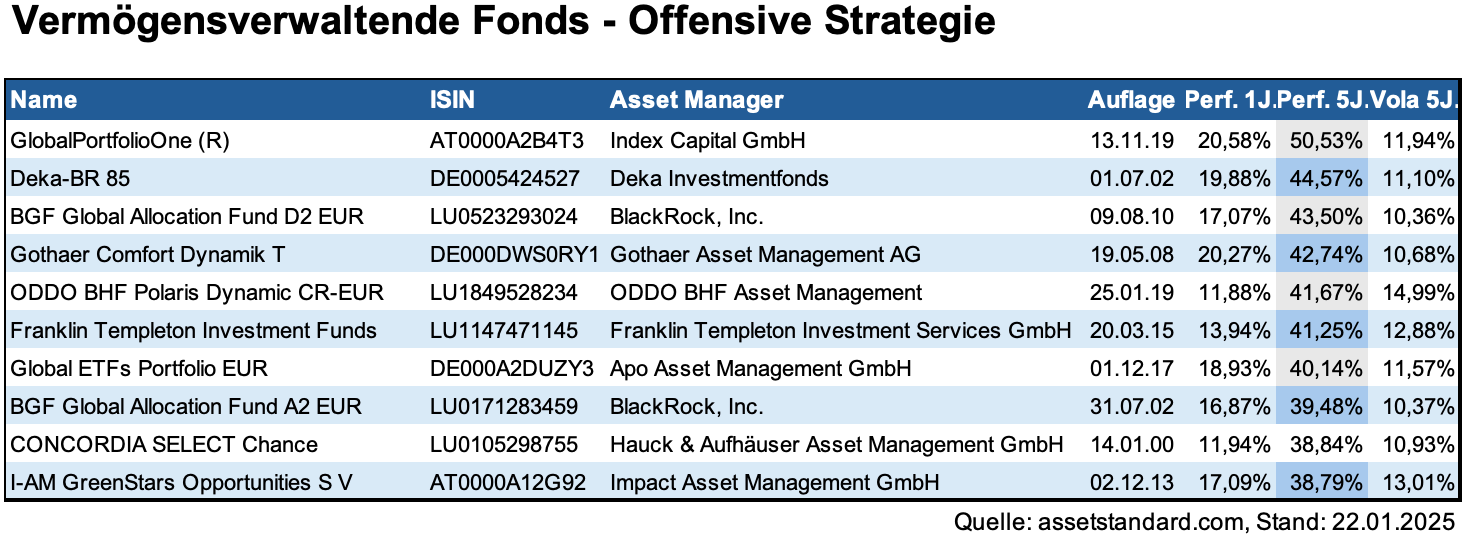 Der Deka-BR 85 verfolgt ebenfalls eine offensive Strategie. Der Fonds hat in den vergangenen fünf Jahren eine Performance von 44,57 Prozent erreicht. Auch der BGF Global Allocation Fund D2 EUR, verwaltet von BlackRock, ist in diesem Zusammenhang erwähnenswert. Dieser Fonds bietet eine globale Diversifikation mit einem starken Fokus auf Wachstumschancen und erzielte in den zurückliegenden fünf Jahren eine Rendite von 43,50 Prozent.