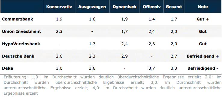 Testsieger über alle Kategorien ist mit einer Gesamtnote von 1,7 erneut die Commerzbank mit ihrer Produktreihe VermögensManagement, die von Allianz Global Investors gemanagt wird. Die überdurchschnittlichen Performance-Ergebnisse werden flankiert von weiterhin durchgängig sehr guten Resultaten beim Risikomanagement.
