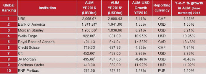 Von den 25 größten Vermögensverwaltungen konnten 22 gegenüber 2015 ihre Assets steigern. Vor allem chinesische Institutionen generierten Marktanteile. Den stärksten Zuwachs verbuchte mit fast 33% die China Merchants Bank. Die Bank of China steigerte ihre Assets um etwa 23%. Die höchsten Verluste fuhren 2016 Banken mit europäischen Wurzeln ein. Die Deutsche Bank musste Abflüsse von knapp 90 Mrd. Euro hinnehmen – sie verlor damit etwas mehr als ein Viertel ihrer Assets. Der HSBC entzogen Anleger mit 39 Mrd. Euro gut ein Siebtel ihres AuM. Bei JP Morgan sanken die Assets um ein halbes Prozent auf jetzt 435 Mrd. USD.