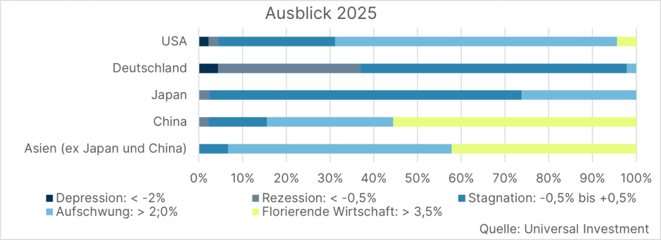 Laut der jährlichen Vermögensverwalter-Umfrage von Universal Investment wird sich die globale Wirtschaft 2025 positiv entwickeln. Die Mehrheit der rund 50 Teilnehmer erwartet einen Aufschwung in den USA und eine florierende Wirtschaft in Asien, insbesondere in China. Im Gegensatz dazu rechnen die Vermögensverwalter für Europa und Deutschland mit einer Rezession oder Stagnation.