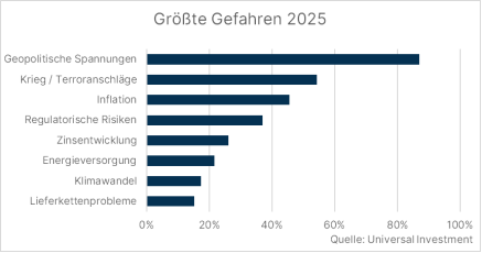 Investmentrisiken sehen die Umfrageteilnehmer vor allem in der politischen Großwetterlage: 87 Prozent der Befragten betrachten geopolitische Spannungen als größte Gefahr für die Kapitalmärkte. Auf Platz zwei folgen Kriege und Terroranschlägen (54 Prozent) und auf Platz drei – trotz der positiven Entwicklung in diesem Jahr - die Inflation mit knapp 46 Prozent.