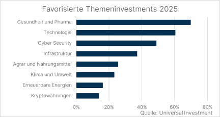 Bei Themeninvestments liegt Pharma mit 70 Prozent auf Platz eins und überholt damit Technologie (60 Prozent). Cyber Security (49 Prozent) und Infrastruktur (37 Prozent) folgen auf den Plätzen drei und vier. Klima und Umwelt landen nur auf dem sechsten Platz mit 23 Prozent.
