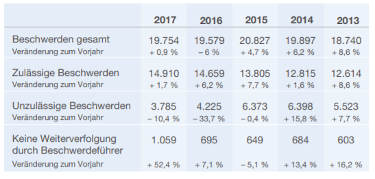 Im letzten Jahr gingen bei der Schlichtungsstelle 14.910 zulässige Beschwerden ein. Damit zeigten sich so viele Versicherungsnehmer unzufrieden mit ihrer Versicherung wie noch nie seit Beginn der Aufzeichnung im Jahr 2001. Gegenüber dem Vorjahr stieg die Zahl um 1,7%: 2016 betrug die Zahl der zulässigen Beschwerden noch 14.659.