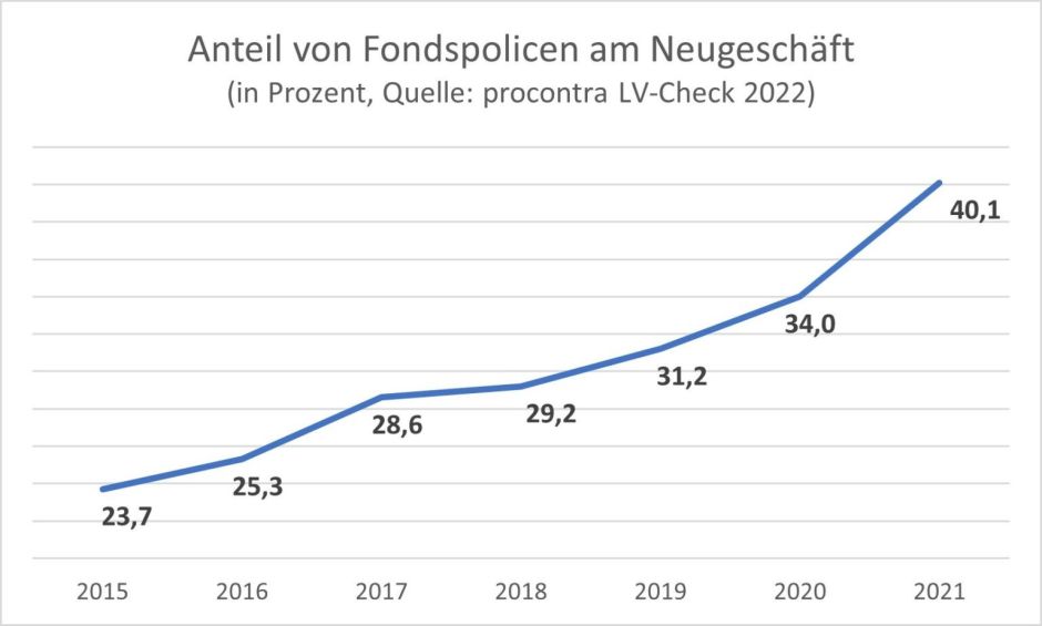 Lebensversicherungsgesellschaften mit traditionell hohem Bestand an fondsgebundenen Lebensversicherungen sind die AachenMünchner, Zürich, Allianz, HDI, AXA, Nürnberger und WWK. Weil immer mehr Anbieter klassischer Lebensversicherungsprodukte Schwierigkeiten hatten bei sinkendem Zinsniveau die hohen Garantiezinsen ältere Policen am Kapitalmarkt zu bekommen, trennten sich etliche Lebensversicherer von ihren Altbeständen mit relativ hohen Zinsgarantien. Sogenannte Run-off-Plattformen wie Athora, die Frankfurter Leben-Gruppe oder die Viridum Gruppe, die sich auf die kostengünstige Verwaltung der Altbestände spezialisiert hatten, übernahmen eine große Anzahl von Policen von der Generali Leben, der Delta Lloyd Deutschland, der ARAG Lebensversicherung und der Basler Leben. Auch viele Lebensversicherer, die ihren Altbestand weiter selbst managen, stellten das Neugeschäft klassischer Lebensversicherungsprodukte mit Zinsgarantien ein. Stattdessen forcierten sie das Angebot und die Vermittlung fondsgebundener Altersvorsorgeprodukte – meist ohne Garantien während der Ansparphase. Der Anteil fondsgebundener Versicherungen wuchs laut einer Auswertung des Fachmagazins „procontra“ am gesamten Neugeschäft 2021 auf 40,1 Prozent. 2015 lag der Anteil fondsgebundener Versicherungen noch bei 23,7 Prozent (siehe Grafik Anteil der Fondspolicen am Neugeschäft).