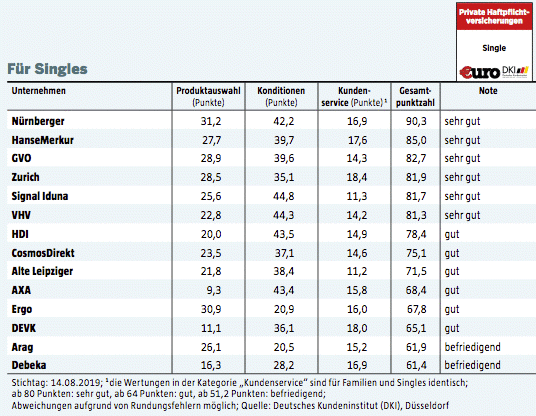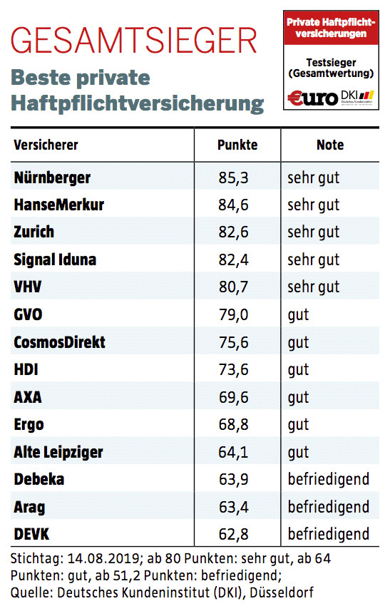 In der Gesamtwertung geht Platz 1 mit der Note "sehr gut" an die Nürnberger (Tarif Familie: "Privathaftpflichtversicherung Komfort inkl. Komfort Plus"; Single: "Privathaftpflichtversicherung Kompakt"). Der Anbieter erreicht bei Konditionen ein "gut". Im Musterfall 1 ist der Tarif der viertteuerste, alle 24 abgefragten Leistungen sind enthalten, und die Deckungssumme ist mit 50 Millionen Euro höher als gefordert. Im Musterfall 2 ist der Tarif der viertgünstigste, 22 der 24 abgefragten Leistungen sind enthalten.