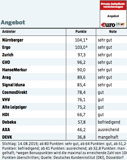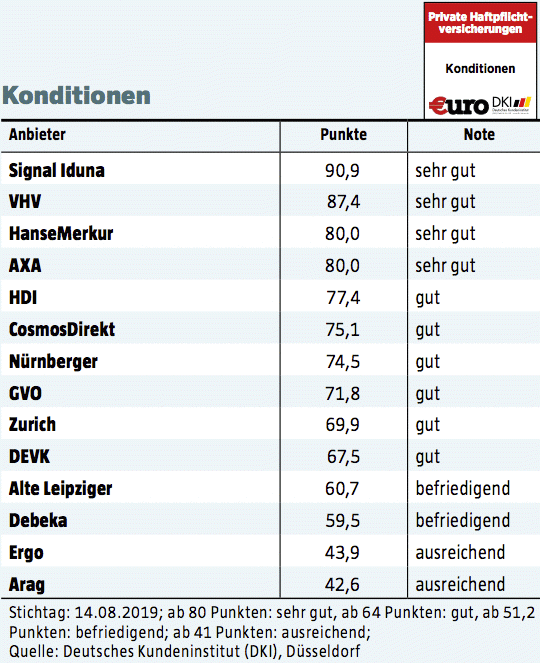Das Deutsche Kundeninstitut (DKI) hat für €uro private Haftpflichtversicherungen von 14 Anbietern auf 340 Kriterien gecheckt. Zwölf weitere Versicherer wurden angefragt, nahmen jedoch nicht teil. Testkategorien sind Konditionen (Gewicht: 50 Prozent), Angebot (30 Prozent) und Kundenservice (20 Prozent). Es gab zwei Modellfälle. Hier einige Annahmen beziehungsweise geforderte Konditionen: