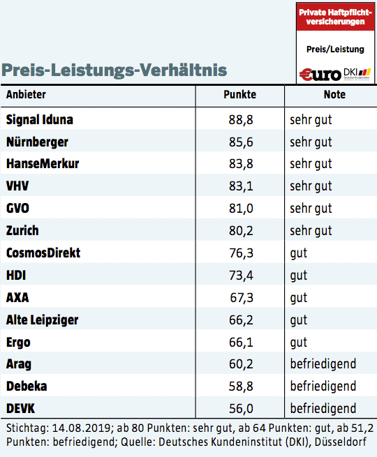 Bei den Prämien sparen. Das Deutsche Kundeninstitut (DKI) hat im Auftrag von €uro private Haftpflichtpolicen getestet. Zu den wichtigsten Ergebnissen zählt: Die Jahresprämien weichen bis zum Dreifachen voneinander ab. Am größten ist der Unterschied beim Modellfall 2, einem weiblichen Single. Die Signal Iduna nimmt hier 39,27 Euro, bei Ergo sind es 125,87 Euro. Im Modellfall 1, einem Familienvater mit siebenjähriger Tochter, beträgt die Differenz immerhin das Zweieinhalbfache. Wiederum ist Signal Iduna am günstigsten (64,12 Euro), am teuersten ist die Arag (159,00 Euro). In allen Fällen haben die Anbieter die Anforderungen erfüllt oder gar übererfüllt.
