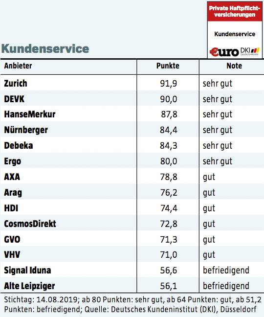 Den letzten Platz in der Gesamtwertung belegt die DEVK mit "befriedigend" (Familie: "Familien-Haftpflicht-Premium-Schutz"; Single: "Single-Haftpflicht - Premium-Schutz"). Hauptgrund ist die Note "mangelhaft" beim Angebot. Hier kann der Kunde quasi nichts selbst beeinflussen. Festgelegt sind Deckungssumme, Laufzeit und eine Selbstbeteiligung von 150 Euro. Zudem gibt es keine Familien- oder Laufzeitrabatte. Bei den Konditionen gab es ein "gut", die Prämien liegen in beiden Musterfällen in der oberen Hälfte des Gesamtfelds. Der Kundenservice ist "sehr gut" - mit überdurchschnittlich schnellen Mitarbeitern und einem reich bestückten Internetauftritt inklusive Live-Chat.