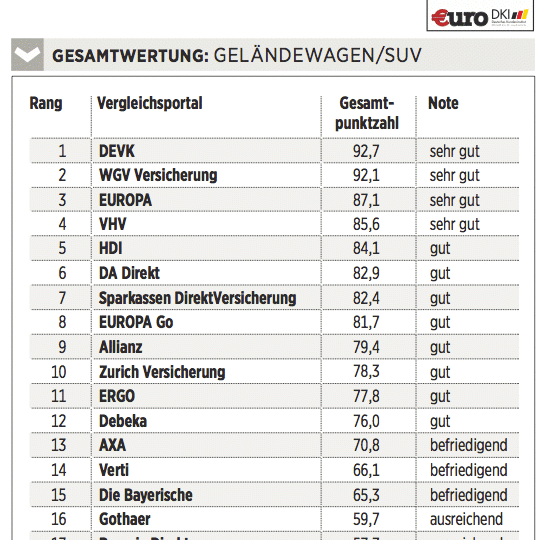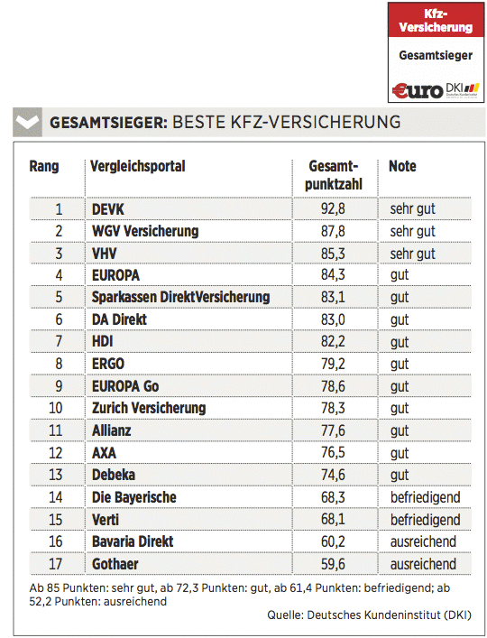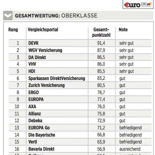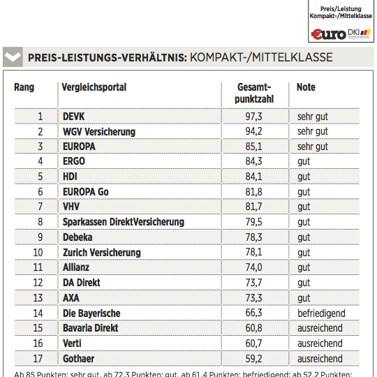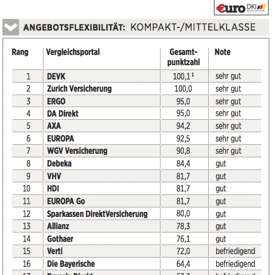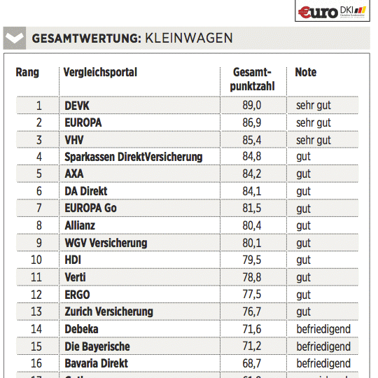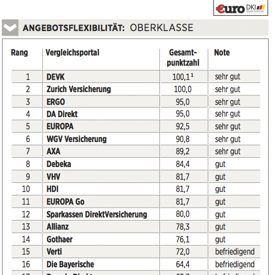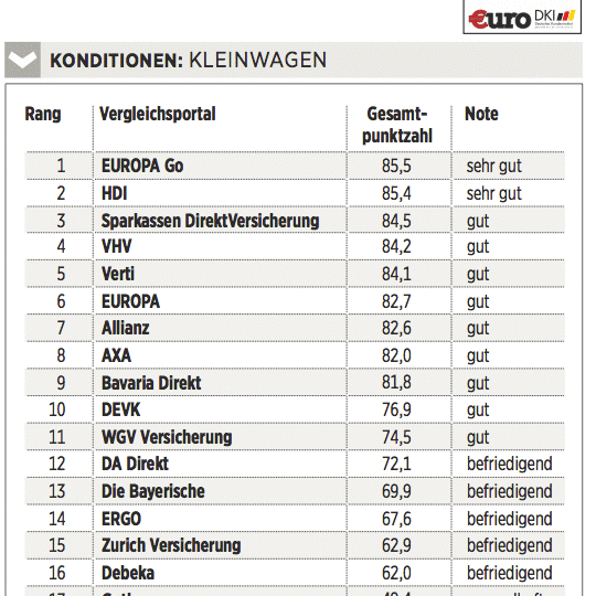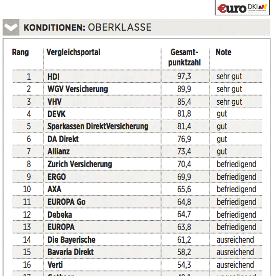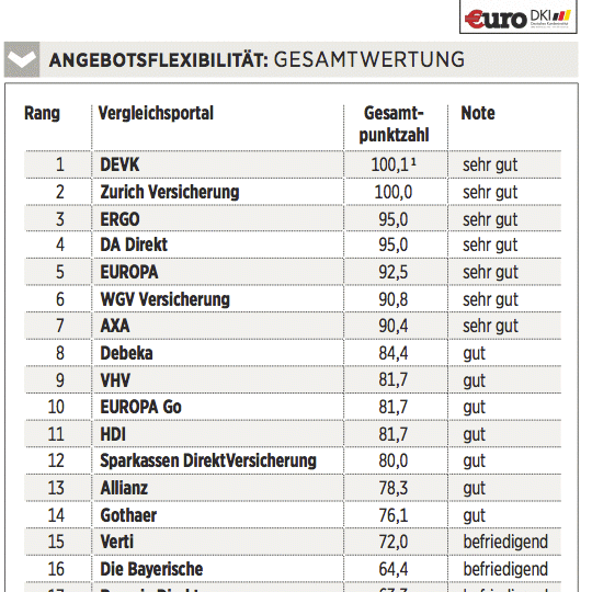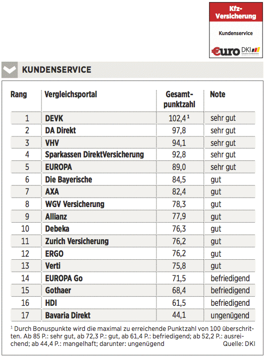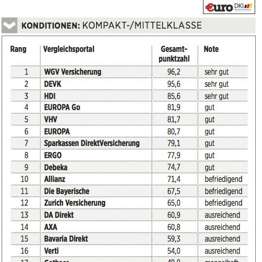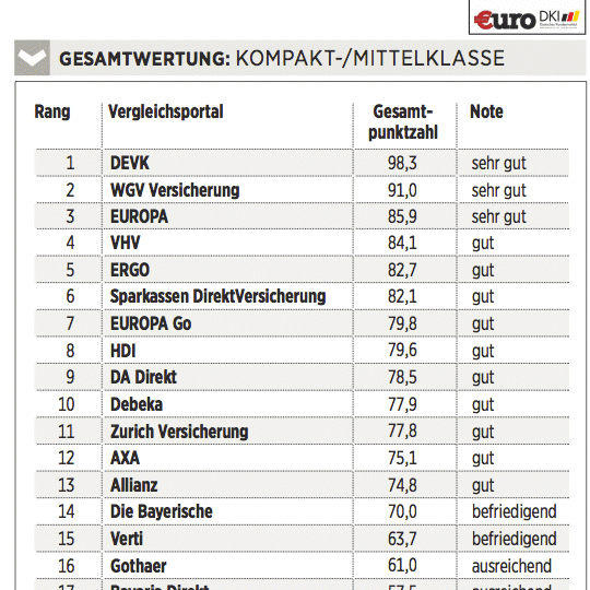 Das Deutsche Kundeninstitut (DKI) hat für €uro 17 Kfz-Versicherungen auf rund 435 Kriterien gecheckt. Das geschah erstens durch Befragen der Anbieter, zweitens mit Testanrufen und Test-E-Mails und drittens durch Analyse der Internetseiten. Testkategorien sind Konditionen (Gewicht: 50 Prozent), Angebotsflexibilität (30 Prozent) sowie Kundenservice (20 Prozent).