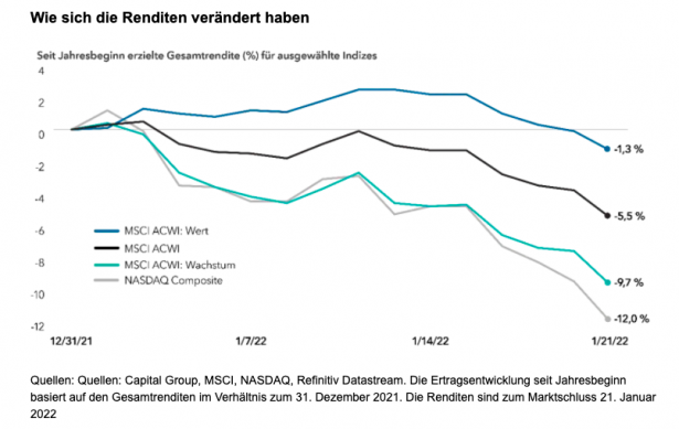 Das Ausmaß der Marktkorrektur spiegelt die zunehmend risikoaverse Stimmung der Anleger wider und trifft teuer bewertete Wachstumsaktien und spekulative Anlagen wie Kryptowährungen besonders hart. Derweil haben sich eher wertorientierte Aktien aus den Bereichen Energie, Finanzwerte und Basiskonsumgüter besser entwickelt, was darauf hindeutet, dass sich eine längerfristige Marktrotation abzeichnet.