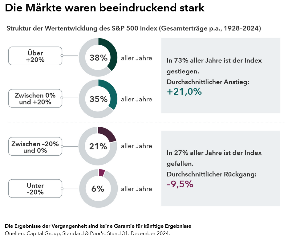 Ein Blick auf die Wertentwicklung des S&P 500 Index seit 1928 zeigt, dass dieser in 73% der Jahre gestiegen ist, also im Durchschnitt in drei von vier Jahren. In nur 27% der Zeiträume verbuchten Aktien Jahresverluste.