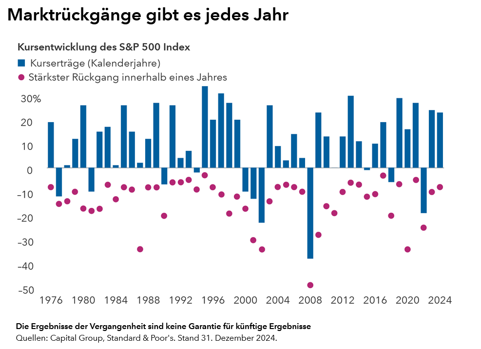 Marktrückgänge sind schmerzhaft, aber man darf nicht vergessen, dass die Märkte zuletzt vergleichsweise stabil waren. Trotz neuer Allzeithochs betrug der größte Rückgang des S&P 500 im Jahr 2024 etwa 8%, gefolgt von einer Erholung innerhalb weniger Tage.