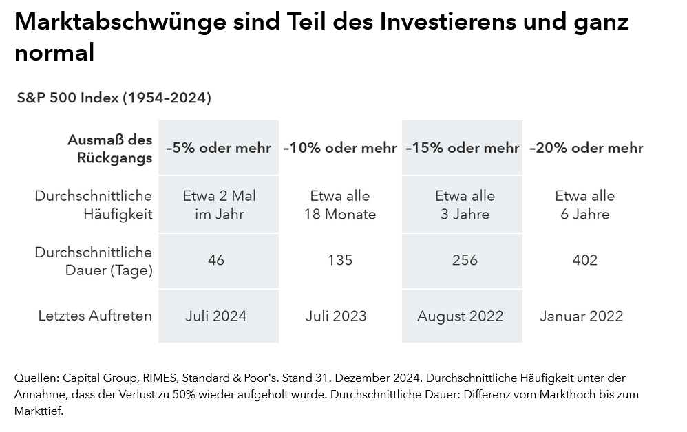 Aber ein Blick in die Vergangenheit zeigt, dass Marktrückgänge regelmäßig stattfinden. Korrekturen, also Rückgänge um mindestens 10%, gab es etwa alle 18 Monate, und etwa zwei Mal im Jahr fiel der Index um mindestens 5%.