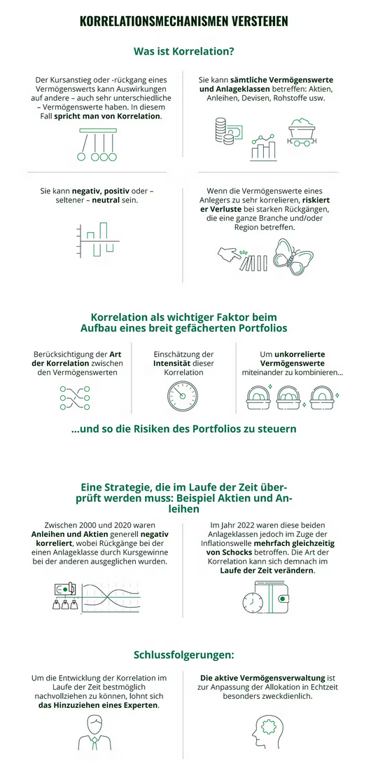 Dies zeigt: Die Berücksichtigung von Korrelationen bei der Portfoliodiversifizierung kann zur Verringerung von Risiken beitragen, indem man die Anlagen auf verschiedene Vermögenswerte und Anlageklassen wie Aktien, Anleihen, Rohstoffe, Währungen und Immobilien verteilt.