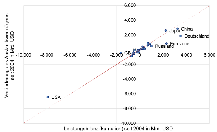 Die vorliegende Grafik zeigt, dass Waren- und Geldströme korrespondieren. Dennoch sind die 2 Seiten derselben Medaille nicht vollkommen deckungsgleich, da Währungsveränderungen auftreten und nicht alle Investitionen sich rechnen. Die Schere von Leistungsbilanzüberschüssen und Auslandsvermögen (rote 45°-Linie) geht insbesondere in der Eurozone und Deutschland auseinander. Das Auslandsvermögen stieg damit nicht im gleichen Ausmaß mit den kumulierten Handelsüberschüssen. Unternehmen, Banken und Sparer aus der Eurozone bzw. Deutschland haben folglich ihr Kapital im Ausland verlustreich angelegt.