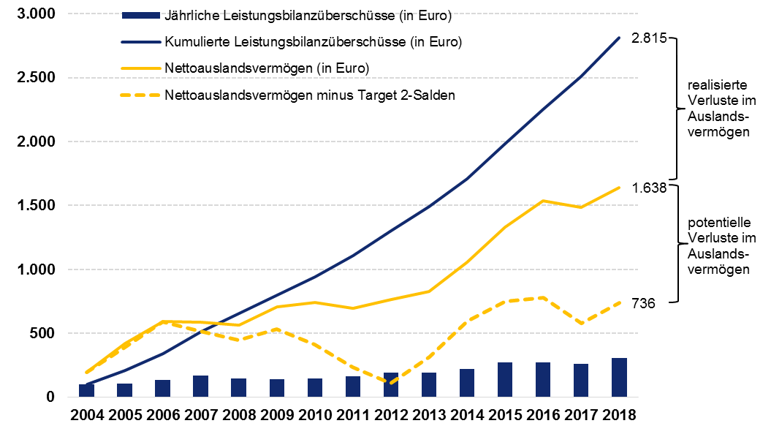 Leistungsbilanzüberschuss von ca. 2.800 Mrd. Euro erwirtschaftet (blaue Säulen