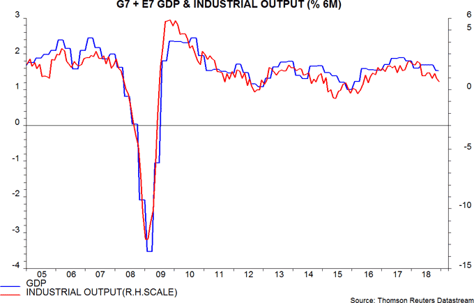 How is this forecast playing out? The first chart shows six-month / two-quarter changes in industrial output and GDP in the G7 economies and seven large emerging economies, with the latest data points referring to December and the fourth quarter respectively. Six-month industrial output momentum fell to 0.7% in December, the lowest since 2016 but well above troughs of -0.2% and -0.7% reached in 2012 and 2015. Two-quarter GDP growth, meanwhile, has also fallen but remains respectable, at 1.5% (3.1% annualised) in the fourth quarter.