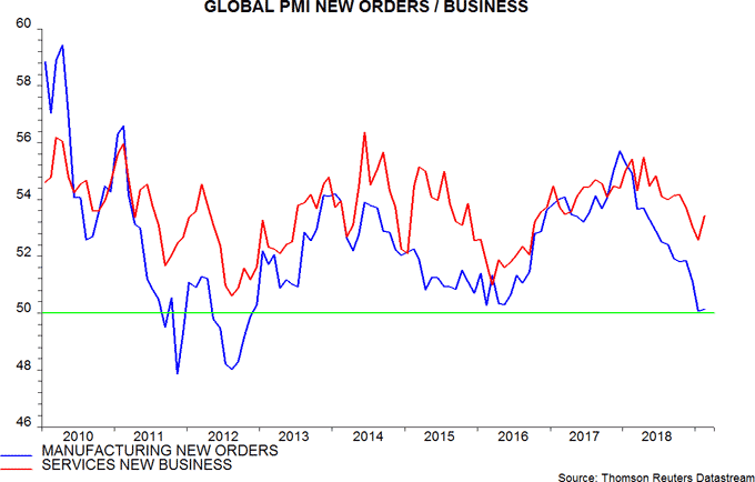 The second chart shows new orders / business components of the global manufacturing and services purchasing managers’ surveys, which supposedly offer a more timely read on economic activity. The final reading of the manufacturing new orders index for February was higher than suggested by earlier flash data but still represents the joint weakest (with January) result since 2012, i.e. undershooting a 2016 low. The services new business index remains solid but a positive divergence with manufacturing is normal in the early downswing phase – similar temporary resilience was displayed in 2012 and 2015.