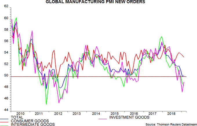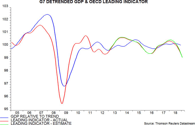 The above series are coincident indicators of economic activity; the OECD’s composite leading indicators are useful for assessing short-term prospects. The third chart shows the deviation of G7 GDP from a statistical trend along with the OECD’s G7 leading indicator, including a January estimate (official data are released on 11 March). Based on the estimate, the decline in the indicator from a peak in February 2018 is already comparable with the peak-to-trough falls in 2011-12 and 2014-16. A caveat, however, is that the level of the indicator can often be revised significantly, as trends in the individual components are reestimated to incorporate new data. This caveat is less relevant for the direction of the indicator, which has yet to suggest any bottoming out of economic momentum.