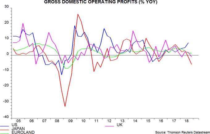 The business investment and profits cycles are closely linked. The fifth chart shows national accounts-based estimates of gross domestic operating profits (EBITDA). Japanese and UK profits contracted in the year to the fourth quarter, while Euroland growth was the weakest since 2013. US fourth-quarter numbers have yet to be released: year-on-year growth is likely to remain solid but the level of profits may have stepped down last quarter, judging from S&P 500 earnings reports.