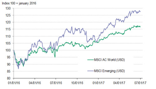 Exhibit 4: Relative performance of equities in developed and emerging markets since 01/01/16 (through 30/06/2017)