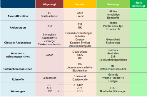 An der Währungsfront haben wir unsere strategische Einschätzung des US-Dollars von „neutral“ auf „negativ“ herabgestuft, die des britischen Pfundes dagegen von „abgeneigt“ auf „neutral“ hochgestuft. Somit ist der Euro unsere bevorzugte Währung. Beide Umstufungen sind den Entwicklungen an den Zinsmärkten, vor allem bei den kurzfristigen Zinsen, sowie der gestiegenen Risikobereitschaft geschuldet.