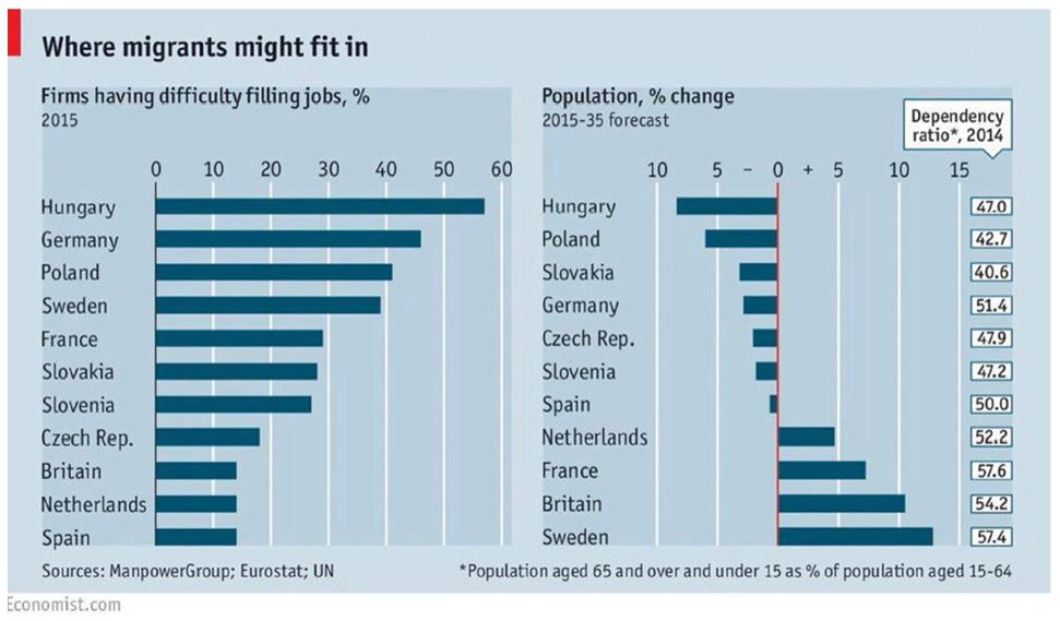 Hungary is a great example. While the country has border patrols at its Serbian borders, nearly 60% of companies mention experiencing difficulties with recruiting workers, given the declining population and a dependency ratio on the labour force of nearly 47%.