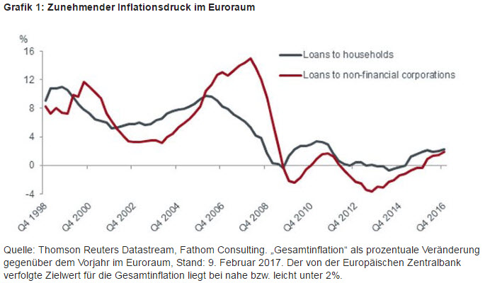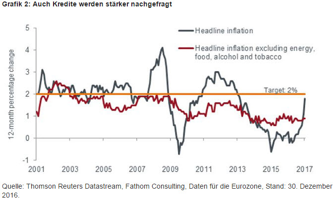 Angetrieben von besseren Wachstumszahlen und aufkommendem Inflationsdruck, dargestellt in Grafik 1, sind die Renditen 10-jähriger deutscher Staatsanleihen auf über 0,3% gestiegen, während ihre US-Pendants sogar bei über 2,3% rentieren (Stand: 8. Februar 2017). Für Banktitel und Erholungswerte hat dies erhebliche Auswirkungen. Denn trotz der massiven Unsicherheit auf der politischen Weltbühne scheint der Markt an eine wirtschaftliche Erholung zu glauben.