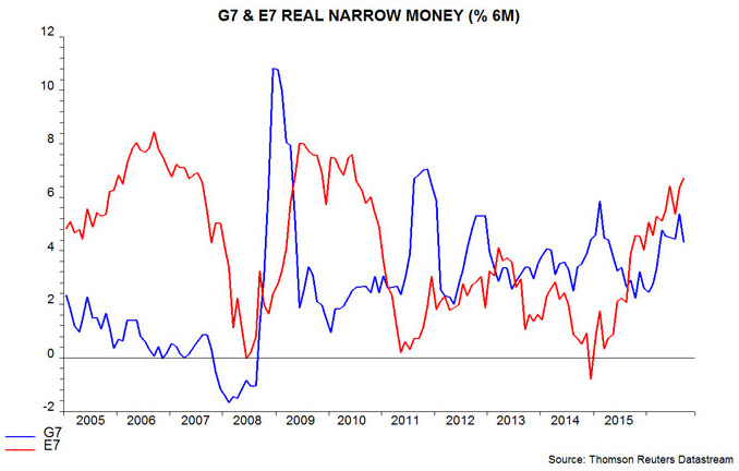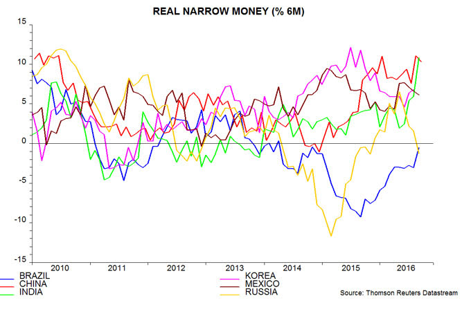 In the E7, Indian real narrow money growth has surged to match Chinese buoyancy. Brazilian weakness is abating but a renewed contraction in Russia suggests that recovery hopes will be disappointed – seventh chart.