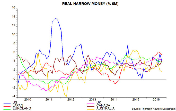 Six-month real narrow money growth rates are similar across the major developed economies. Japan remains at the top, consistent with recent equity market outperformance, with the UK in the middle, arguing against the consensus view that UK GDP growth will be below the G7 average in 2017 – sixth chart.