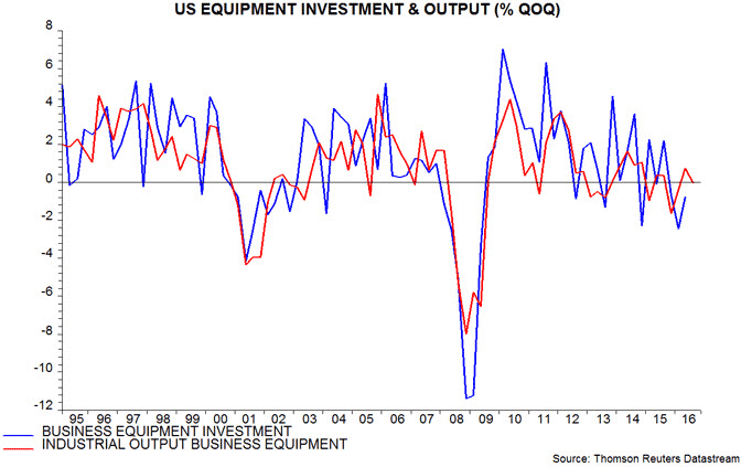 US business investment fell by 0.5% in the year to the second quarter but is expected here to rebound during the second half and into 2017, contributing to a rise in GDP growth. Recent evidence is consistent with this forecast.