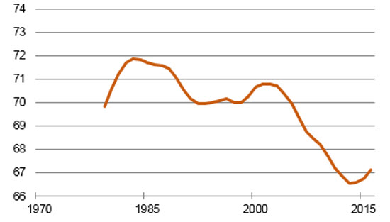 Indiz für die unterschiedlichen Machtverhältnisse auf dem Arbeitsmarkt ist die Lohnquote, das heißt das Verhältnis der Arbeitnehmerentgelte zum Volkseinkommen. In den 70er Jahren war sie bis auf 74 % gestiegen. Das war die Hochzeit der Gewerkschaften. In den 2000er Jahren hat sich das Klima geändert. Die Hartz IV-Gesetze und die in der Finanzkrise stark steigende Arbeitslosigkeit haben die Gewerkschaften geschwächt. Die Lohnquote ging zeitweise um zehn Prozentpunkte bis auf unter 64 % zurück. Die Unternehmensgewinne stiegen an.